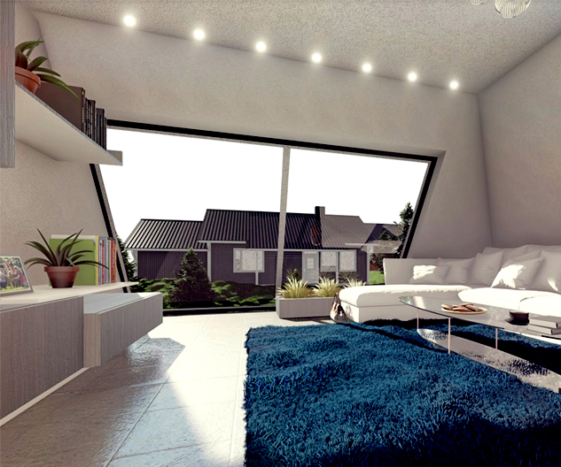 Salon należy do części strefy dziennej. Posiada duże przeszklenie, dzięki czemu słońce wpada do środka oświetlając i ożywiając pomieszczenie. W zimowe wieczory można dodatkowo ogrzać się kominkiem będącym w centralnym punktem piramidy.